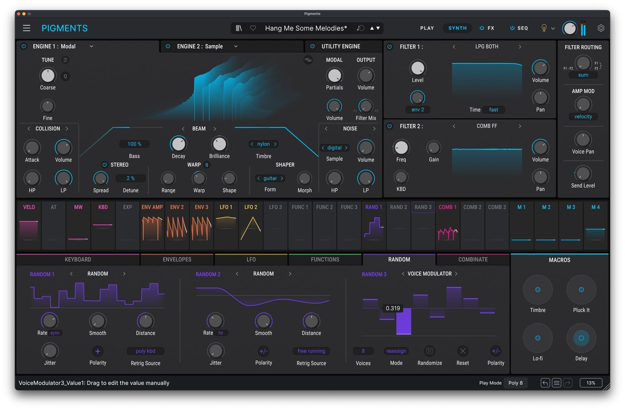 Arturia Pigments is a modern software synthesizer that blends multiple synthesis engines into one deceptively friendly interface, making it equally at home with sound designers and musicians who just want to make something beautiful quickly. It combines wavetable, virtual analog, sample, granular, and additive-style harmonic engines, all of which can be layered and modulated in surprisingly deep ways without feeling like a cockpit full of switches. The real magic is how visual it is: modulation paths light up, envelopes and LFOs animate, and you can literally see the sound evolve as you shape it. Pigments also comes loaded with high-quality filters borrowed from Arturia’s vintage emulations, a generous effects section, and a modulation system that encourages experimentation rather than punishment. The result is a synth that feels both serious and playful, capable of razor-sharp basses, lush cinematic pads, glitchy textures, and polite bread-and-butter sounds that behave themselves when needed.